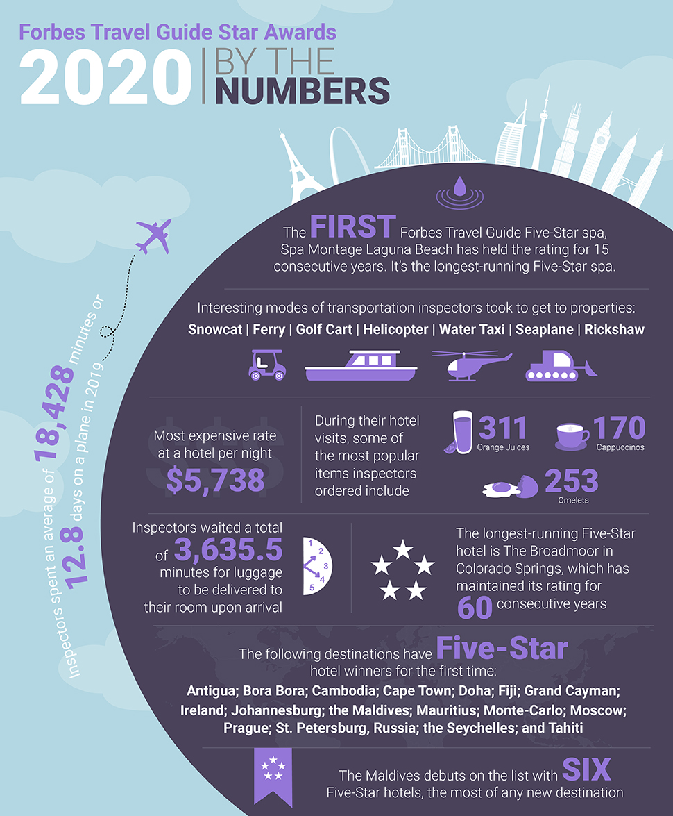 今年福布斯还公布了一些有趣的数字,比如最贵的房晚是 5,738 美元,评委平均花费 12.8 天在飞机上周游世界,马尔代夫首次入榜遍有 6 家酒店入围福布斯五星。