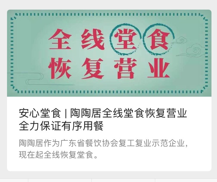 2月20日,陶陶居在官方微信公众号发布消息称,作为广东省餐饮协会复工复业示范企业,陶陶居全线堂食恢复营业,目前各门店正在做出积极措施来保证有序用餐,包括注意门店卫生、关注员工身体健康以及在门店减少桌椅摆放、隔桌就餐等。