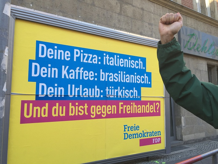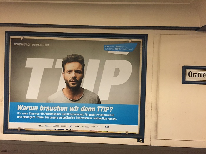 支持TTIP的新自由主义阵营人数相形见绌,但是他们拿出了钱在游行路线沿线做广告。自由民主党(FDP)在街边立起一人高的大广告牌:“你的批萨:意大利的。你的咖啡:巴西的。你的假期:在土耳其。而你要反对自由贸易?”游行者在牌子前笑着举起胳膊拍照。地铁站里,BDI、Bitkom等公司做的大型广告写道:“为什么我们需要TTIP?为更多的就业和创业机会,更多生产力和低价产品,为我们欧洲在全球贸易中的利益。”