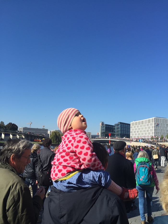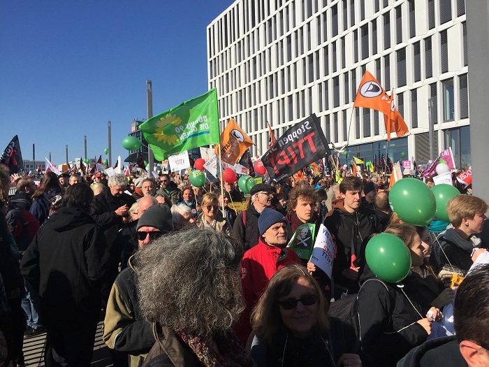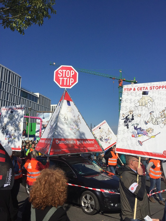 10月10日的柏林反TTIP抗议由多个政党、非政府组织和工会等机构发起,潮水般的示威人群从柏林中央火车站汇集,分路从三个过河大桥往联邦德国的议会大厦区域进发,并穿过驻柏林各游说团体办公室聚集的海因哈德特大街(Reinhardt strasse),继续向米特区中央干道腓特烈大街及周边区域行进。人群中均匀分布了不同年龄段的参与者,从被父母推在小车里的婴儿,到中学生和大学生,再到青壮年和耄耋老人。他们当中不少是乘火车和大巴赶到这里的。