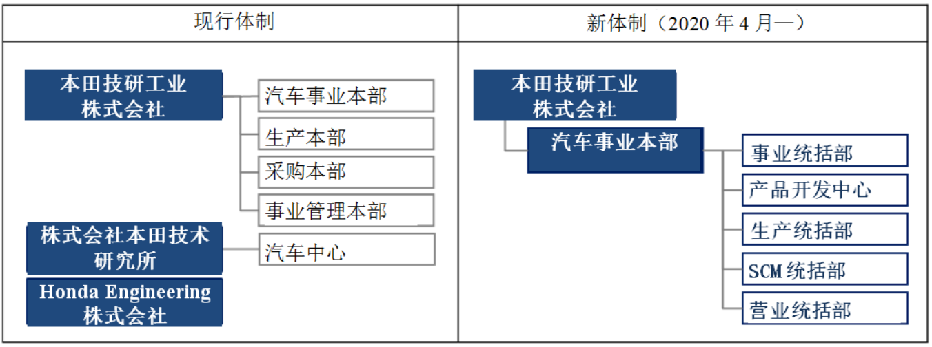 具体来看,将本田技研工业株式会社(以下简称本田技研工业)的生产本部、采购本部和事业管理本部的汽车职能;株式会社本田技术研究所(以下简称本田技术研究所)除设计等部分职能以外的汽车产品开发职能;Honda Engineering 株式会社(以下简称 Honda Engineering)的汽车生产技术开发和设备制造职能全部整合到汽车事业本部。