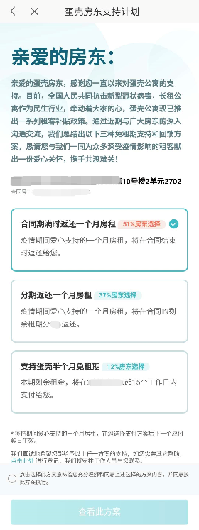 记者发现,在“支持计划”页面最显著的位置,蛋壳公寓首先表达了对广大房东大力支持的诚挚谢意。据相关负责人介绍,对于前期很多已经明确表示不计回报支持免租期的房东,蛋壳公寓将直接在合同期结束返还相应的租金;对于目前尚未明确表态的房东,蛋壳公寓也充分本着协商的原则,提供了三种方案,房东可以自行在个人中心的“蛋壳房东支持计划”页面中选择: