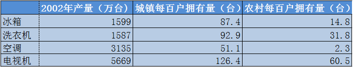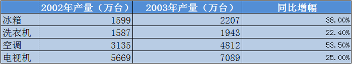 从国家统计局的数据来看,2003年主要家电产品的产销量都超过2002年(当时的产销比在95%以上),同比增幅也超过了2002年。家电行业在先抑后扬中走过了2003年,在2004年初中国家用电器协会发布的《2003年中国家用电器行业回顾》的摘要中这样写道,“2003年,尽管年初受到SARS疫情和主要原材料大幅度涨价等不利因素的困扰,中国家电行业仍然获得了历史性的高增长,在生产与出口两方面都取得了新的突破,中国作为全球家电制造中心的地位更加不可动摇。”