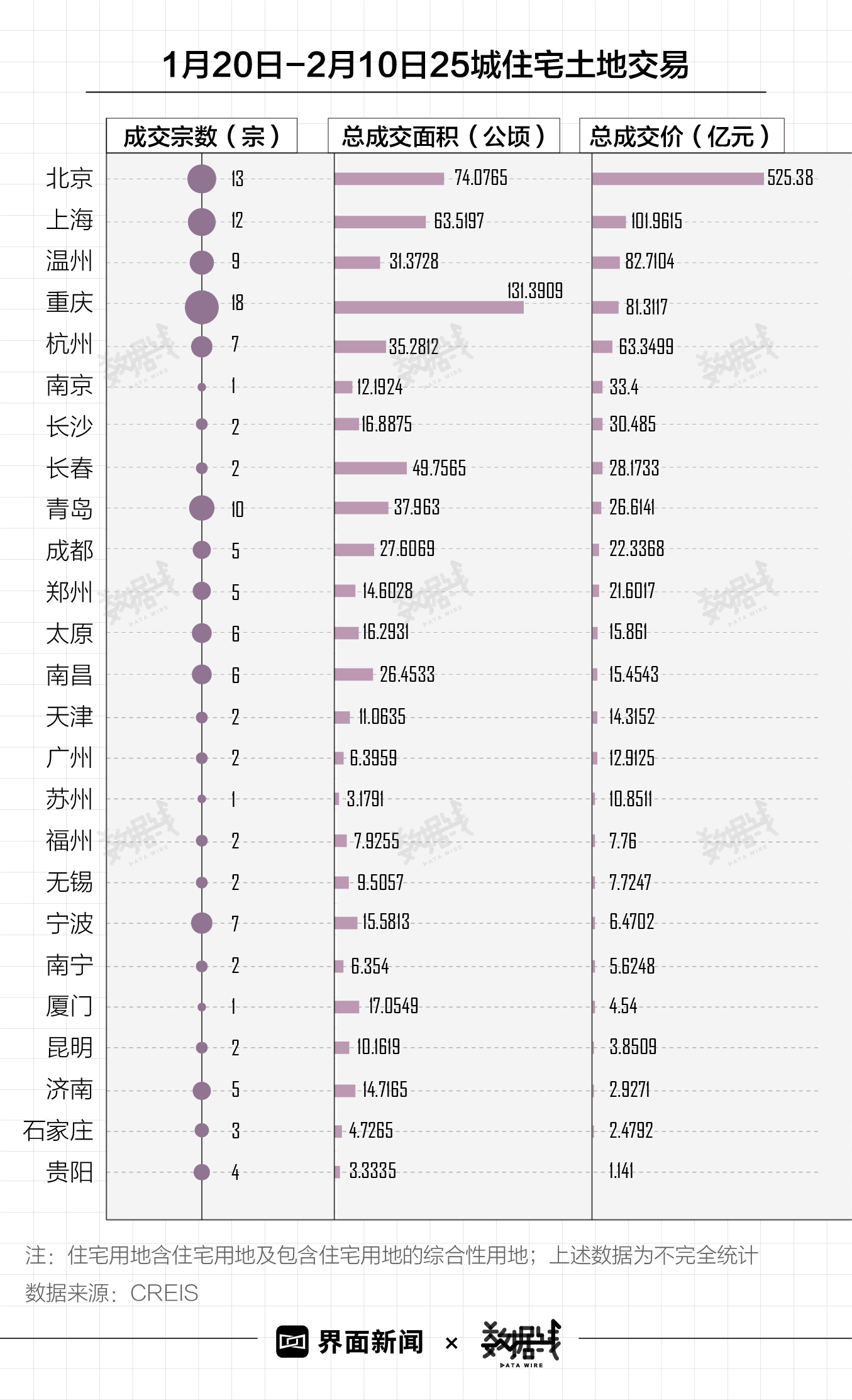 其中,成交最密集的1月22日和2月14日,当日分别完成住宅用地交易18宗和17宗。