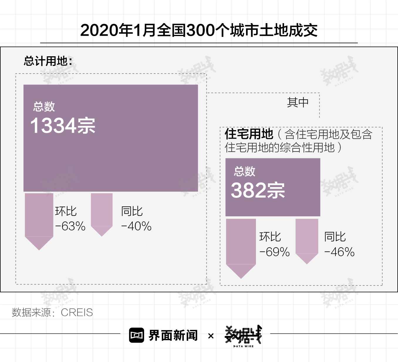 据CREIS,2020年1月,300个城市土地成交共计1334宗,环比下降63%,同比下降40%。其中,住宅用地(含住宅用地及包含住宅用地的综合性用地)总成交382宗,同比下降46%。