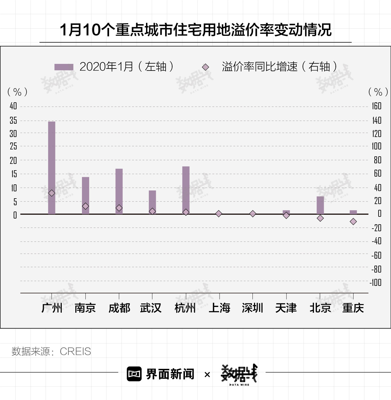 与此同时,在CREIS监控的10个重点城市中,宅地整体平均溢价率环比上涨6个百分点,半数重点城市宅地平均溢价率超去年同期。其中,广州平均宅地溢价率34%,居首位。
