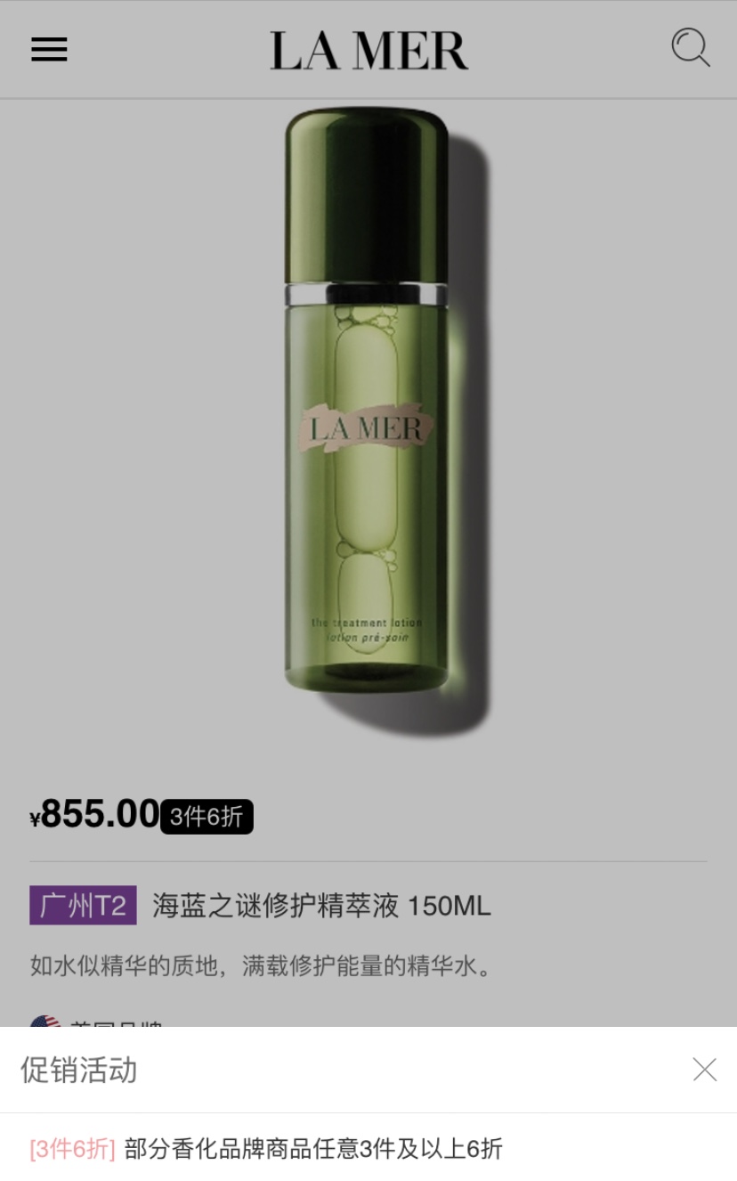 以海蓝之谜修护精萃液150ml为例,这款产品的官方售价为1100元,在中免集团免税店的售价是855元,3件6折后参考价仅为513元。