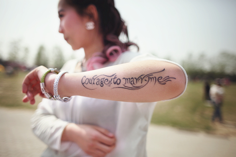 ——2013年9月我为了跳街舞的梦想来北京,谈了三年的男朋友和我分手了。2014年2月14日,人家都过情人节,我去纹身了。纹的是“courage to marry me”(有胆你就娶我)。算是给自己的一个提醒吧,不要人家随随便便一对你好,自己就不行了,有胆你就娶我啊!