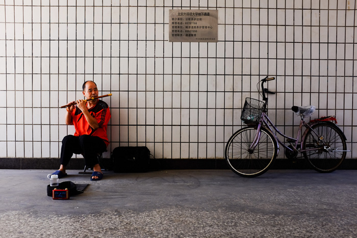 ——我从外地来北京打工,做保洁已经很多年了,周末没事,我也会出来吹吹笛子,多挣一点。
