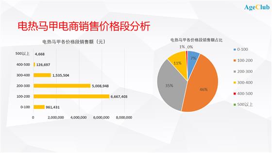 在价格上,Ageclub对电热马甲做了销售价格段分析。发现100元以下电热马甲销售额占比仅为7%,100-200元价格段销售额占比46%,200-300元价格段销售额占比35%,300元以上价格段销售额占比12%。100-300元价格段销售额占比达到81%,是目前电热马甲的主流价位。
