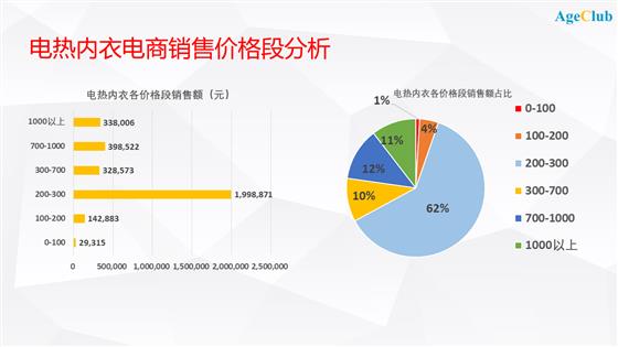 Ageclub对电热内衣电商数据做了销售价格段分析。发现200元以下电热内衣销售额仅占比5%,200-300元价格段销售额占比高达62%,销售额前五名单品价格也都在200-300元价格区间,这一价格区间是目前消费者比较认可的电热内衣价值区间。