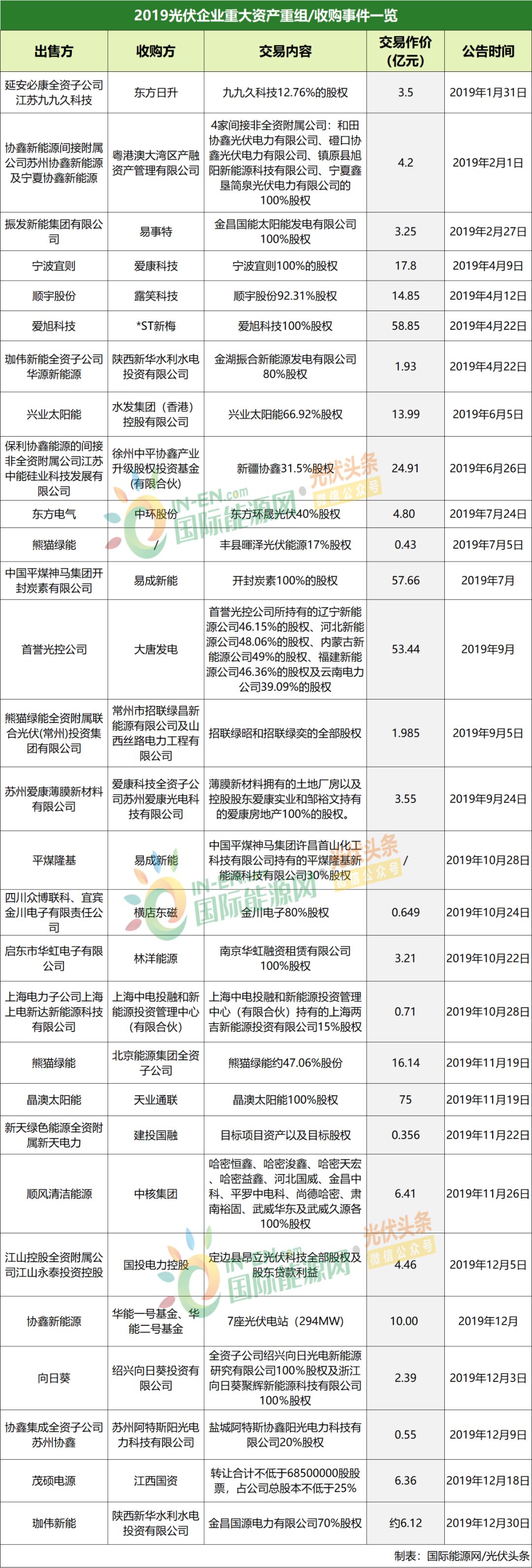 国际能源网/光伏头条统计,2019年内重大并购重组案例近30起,涉及交易金额高达397.5个亿,有的企业经营不善、有的企业借壳上市、有的企业投奔央国企等等。