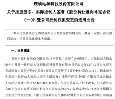 据协议显示,顾永德及其一致行动人拟向江西省国控公司或其指定投资主体转让合计不低于68,500,000股股票,占上市公司总股本不低于25%,但其最终持有的上市公司股票不超过上市公司总股本的30%,收购后,江西省国控公司将取得上市公司实际控制权。江西国资是否能够顺利入主茂硕电源,后续国际能源网/光伏头条也会持续跟踪报道。