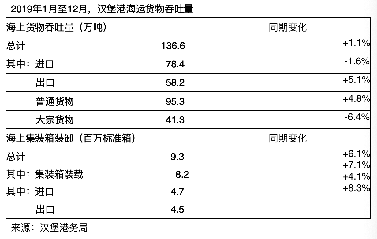 2月21日,界面新闻从汉堡港务局获悉,2019年,汉堡港的海运货物吞吐量增至1.366亿吨,增长1.1%。集装箱吞吐量为930万标准箱,同比增长6.1%。其中,汉堡与中国的海运集装箱运输总量达到260万标准箱,涨幅1.7%。