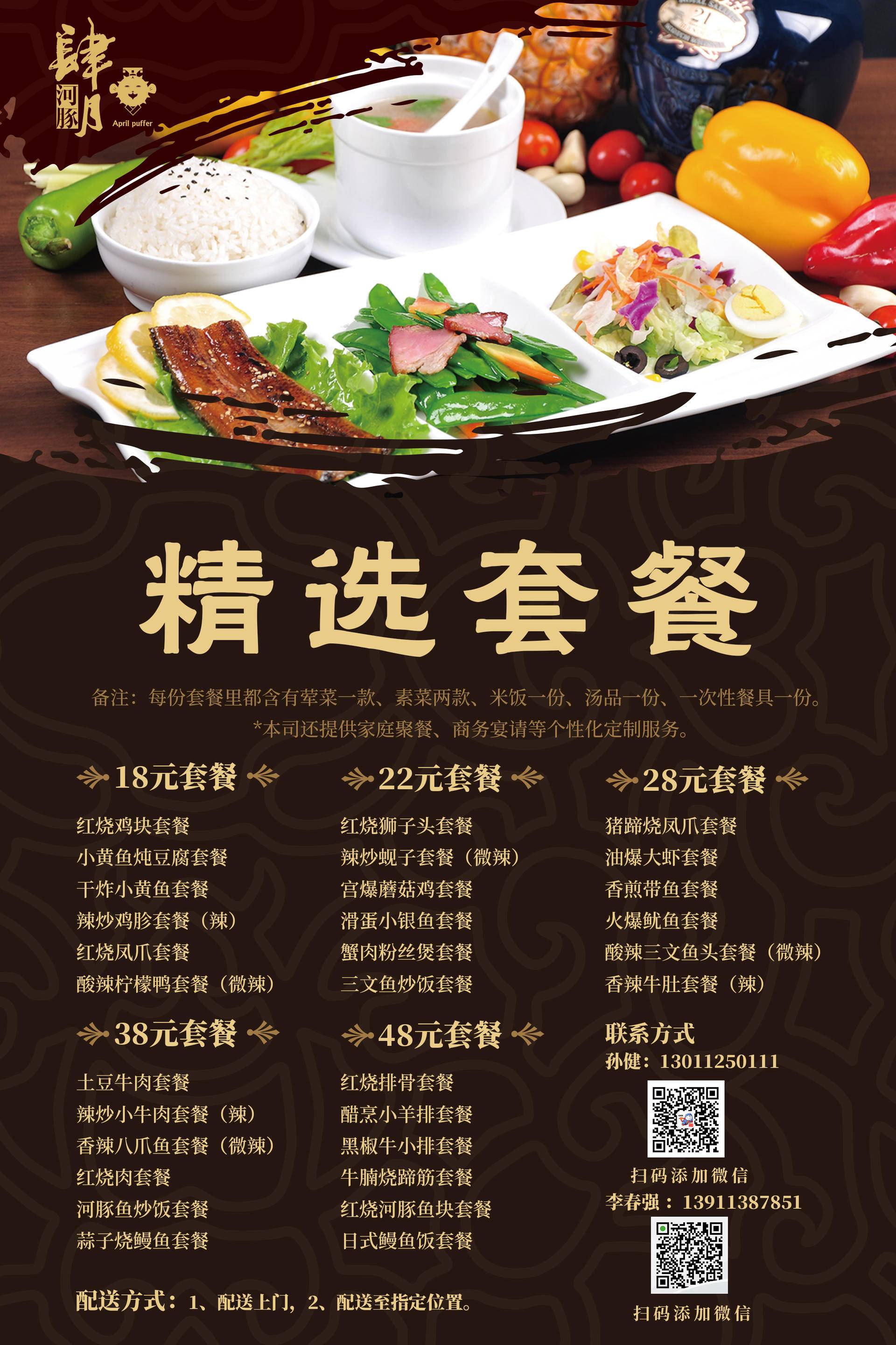 河豚家族推出批量套餐外送服务,通过“无接触配送”的方式,保障复工企事业单位的用餐需求,为政府分忧,为百姓服务。资深的优秀团队,坚持在安全、营养、美味、便捷上深耕细作。从菜品研发、原材料采购,到菜品加工、分销配送,每一个环节都有专人把控,实现食品可追溯,五星品质,大厨坐镇,盒饭价格。每份套餐均含有荤菜一款、素菜两款、米饭一份、汤品一份、一次性餐具一份。