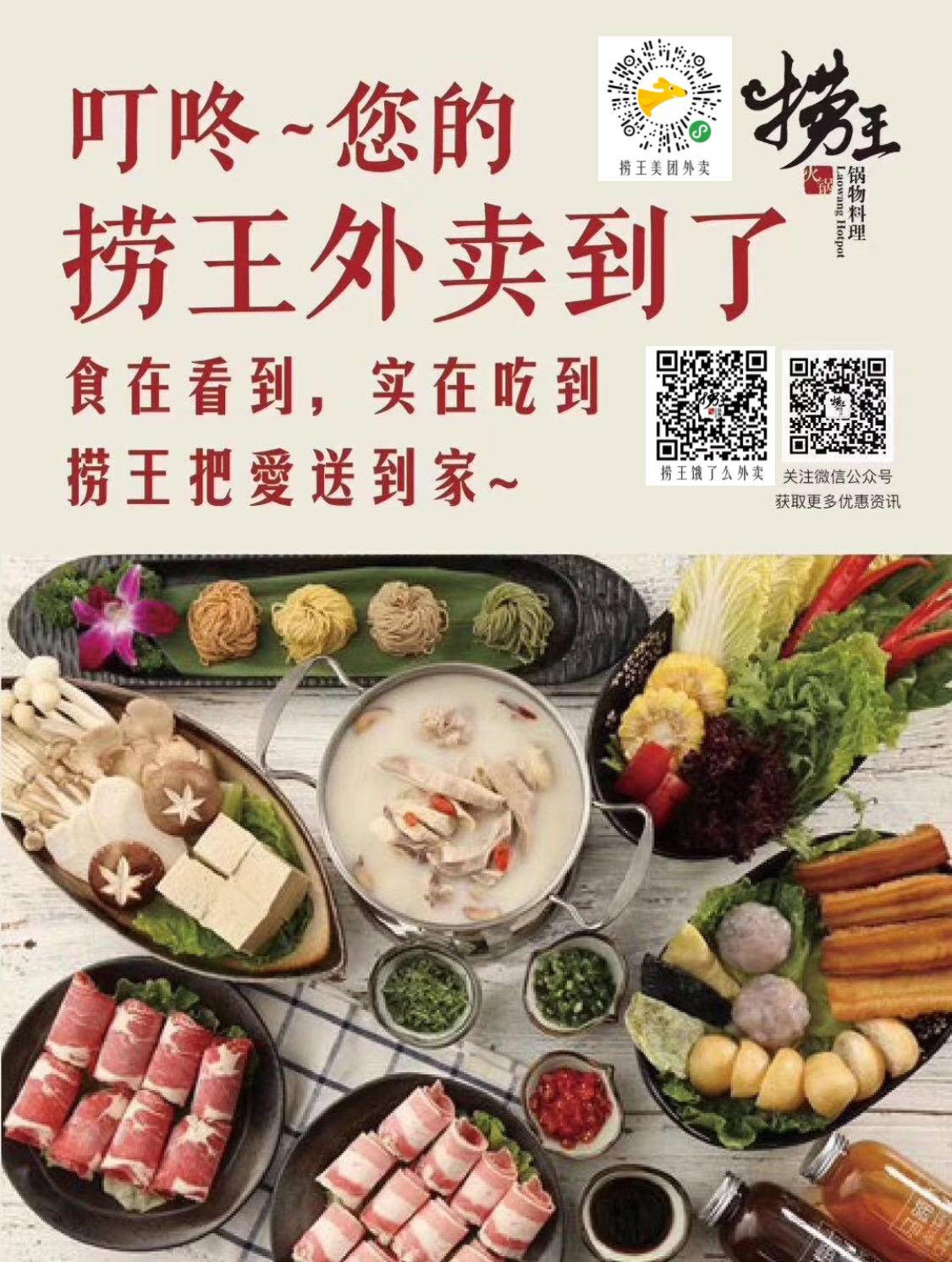捞王锅物料理坚持8小时大火熬制浓汤,独特“一煲四味”吃法,精选上等新鲜食材上,让您“食在看到,实在吃到”。捞王从堂食到外卖,十年坚守,初心依旧,用美食凝聚力量,放心好食材由美团、饿了么于12:00-18:00配送,安全送到家!