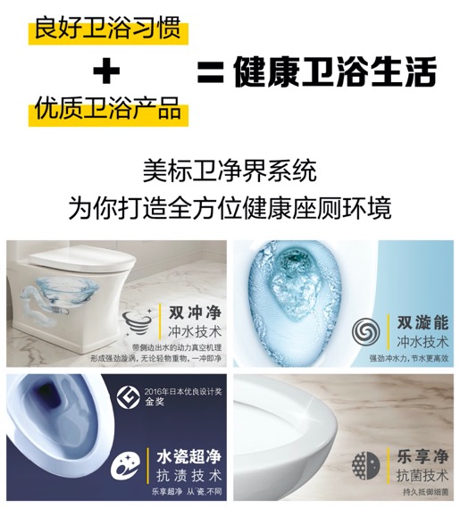 养成每天都注意的健康卫生习惯固然很重要,如能选用具有抗菌、抗渍等洁净技术的卫浴产品,居家防“疫”更能事半功倍。美标的卫净界系列座厕就是消费者的好帮手。美标卫净界系列座厕拥有四大技术:乐享净技术、水瓷超净技术、双冲净及双漩能技术,为大众解决抗菌、抗渍、冲水的三大问题,让卫浴空间更健康安全。