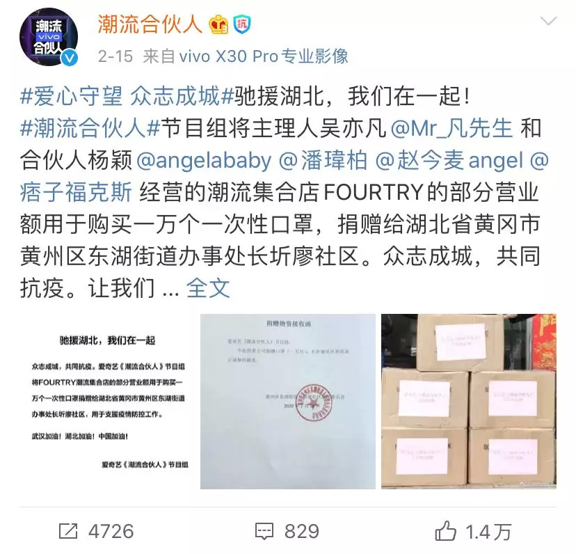 而在肺炎疫情牵动人心的当下,《潮流合伙人》节目组也将FOURTRY潮流集合店的营业额在原有的公益计划上,追加费用购买了上万个医用外科口罩捐赠给湖北用于支援疫情防控工作。节目之外,节目组联动多方在线上发起“#微笑2020#破晓计划”,征集微笑作品,传递希望。