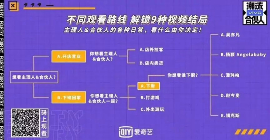 为了更好地和用户互动,《潮流合伙人》利用科技手段对节目衍生内容进行了赋能:引入互动视频玩法,用户可以选择不同的观看路线;在节目相关的页面,用户可以使用VR全景探店功能进行商品购买,也能用奇观(AI雷达),通过扫一扫的方式识别节目中的潮品,在爱奇艺商城实现线上购买;每期节目观看满20分钟的用户,有机会抽签获得FOURTRY全球限定款的购买权限;第二期开启上线框内聊天室,实现用户 “边看边聊”的实时互动需求……这种科技上的赋能,不仅丰富了用户的娱乐体验,也为用户解锁了全新形式的一站式购物体验。