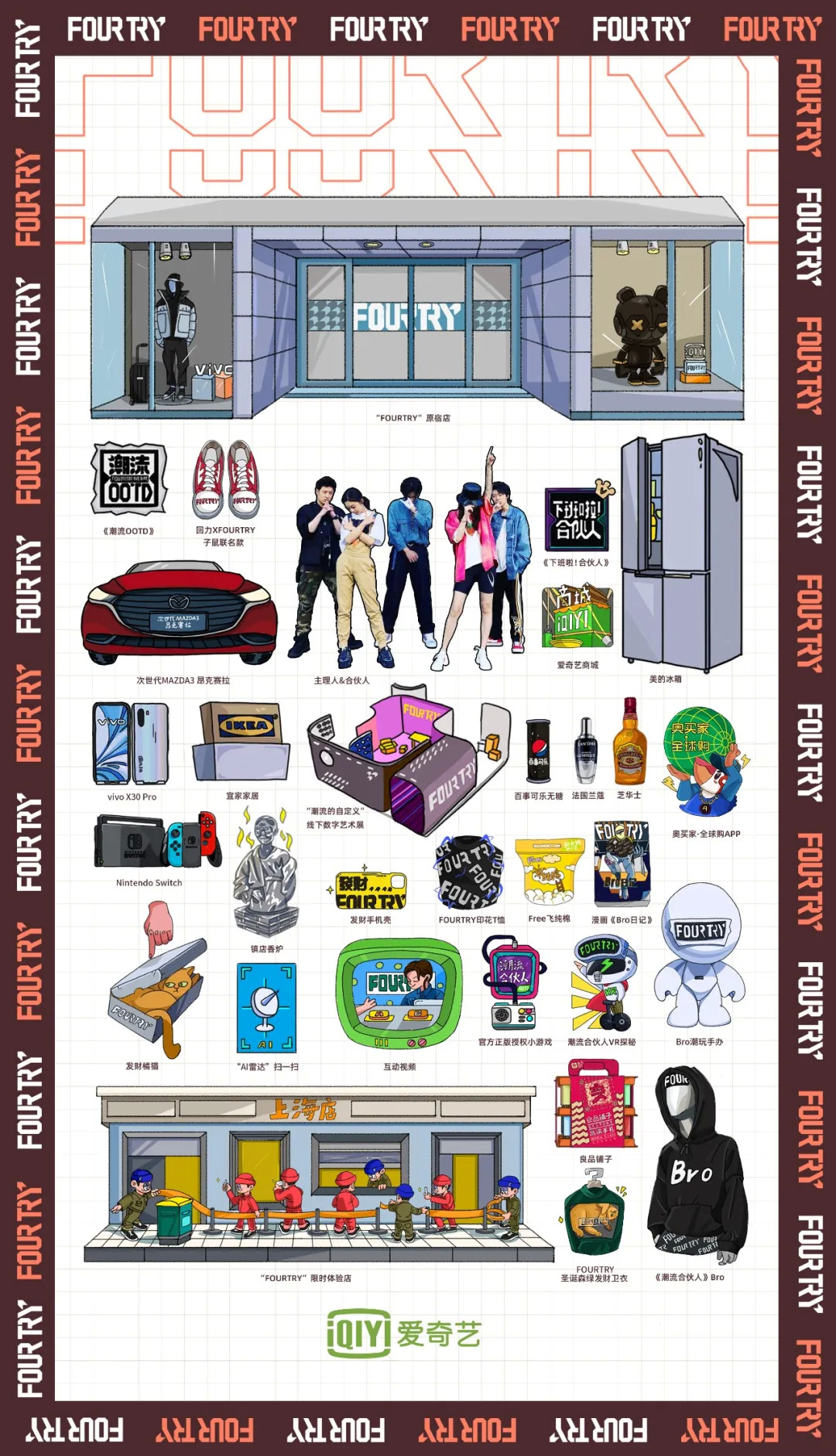 与其他节目不同的是,《潮流合伙人》的节目性质要求IP授权前置,各大潮牌的货品、FOURTRY与其他品牌的联名,必须先通过IP授权,再上架节目录制时的东京FOURTRY店内。所以在节目播出后,在潮流合伙人和嘉宾的衣食住行中,随处可见品牌的身影:店内摆放着vivo的灯箱;嘉宾的座驾是次世代MAZDA3 昂克赛拉;住处的家装布置也是宜家风格……