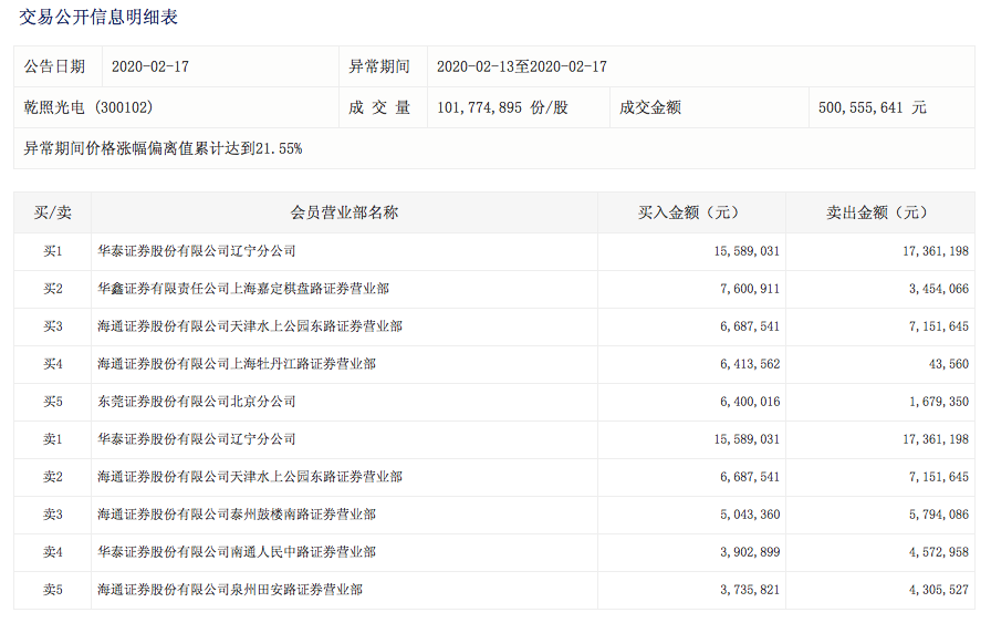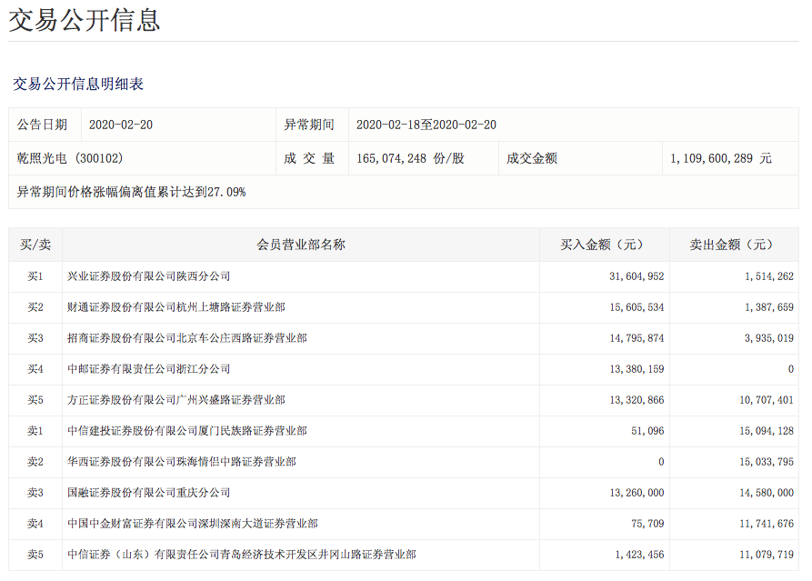 2月20日,乾照光电因异常价格期间涨幅偏离值累计达到27.09%登陆龙虎榜。成交金额达到11.1亿元。兴业证券股份有限公司陕西分公司当日买入3160.5万元,位列买入第一,中信建投证券股份有限公司厦门民族路证券营业部当日卖出1509.4万元,位列卖出第一。
