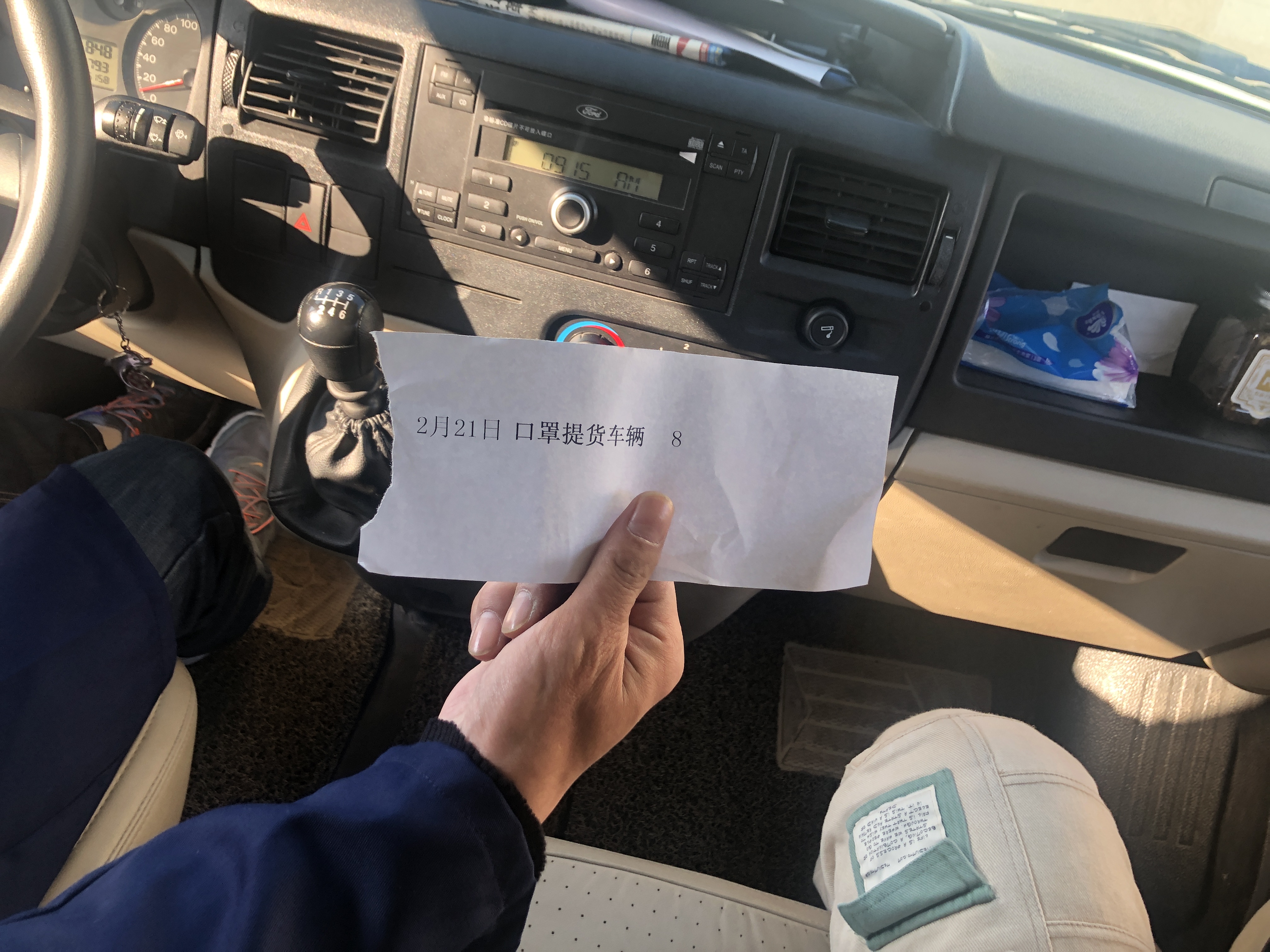 门口的保安把他的车子拦停,上前测了额温,给了他一张纸条,上面写着“2月21日,口罩提货车辆,8”——为了维持秩序,58家企业的车就要按照先来后到依次拿号,排队领货。