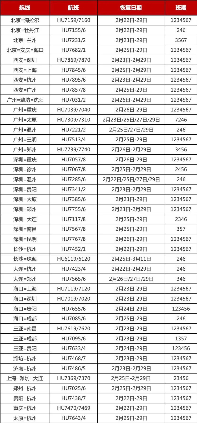 2月22日-29日期间,海南航空将陆续恢复从北京、上海、广州、深圳、杭州、海口、成都、重庆、贵阳、昆明、大连、三亚、郑州、长沙、济南等地始发的450余个航班。