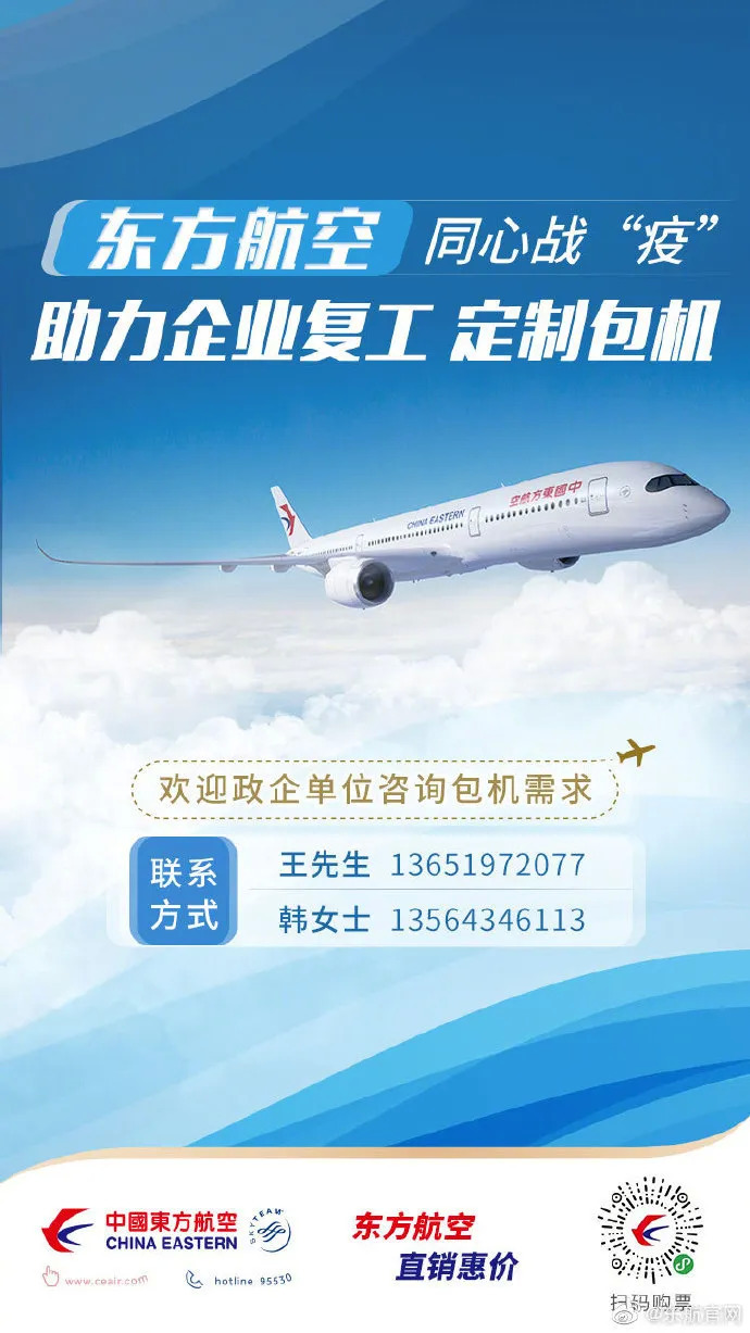 东航全面接受企业有关复工复产包机的申请,凡是全国各地企业有复工包机需求的,50人及以上即可成团(其中湖北地区航线除外)。为进一步做好一站式服务,东航还特别推出了“特约专车,国内接送”的服务产品,为企业复工保驾护航,提供全面出行保障。