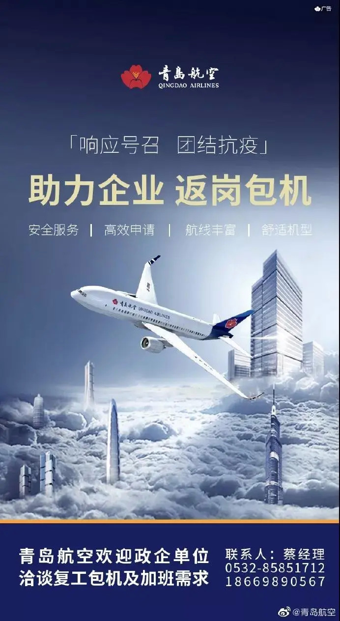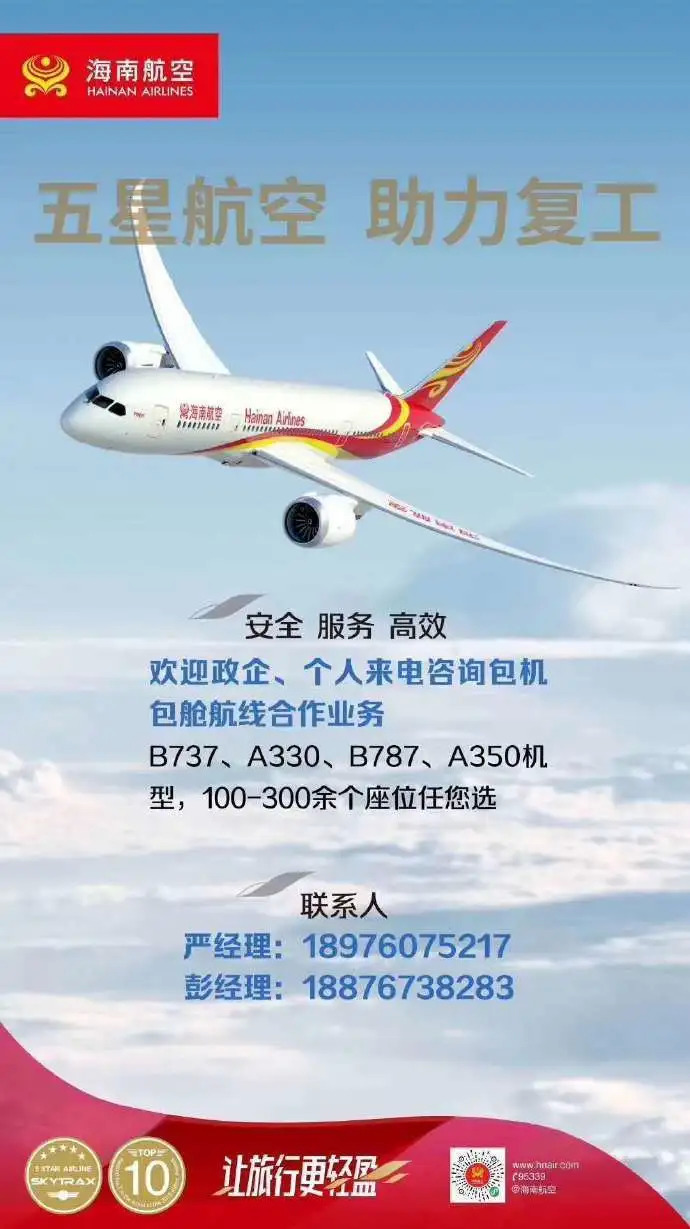 海南航空于2月19日推出政府及企业客户员工返岗包机专项产品,全力支持复工复产,产品推出两日内已累计接收返工等各类临时包机咨询200余次。