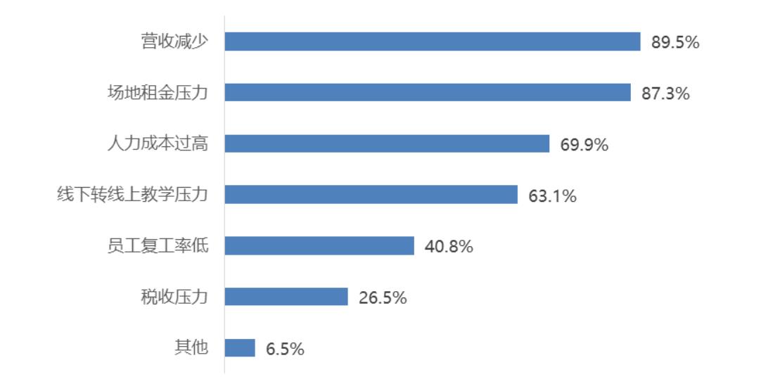 对于校外培训机构经营困难的原因,参与调研的机构认为最关键的因素是营收减少、场地租金压力和人力成本过高。