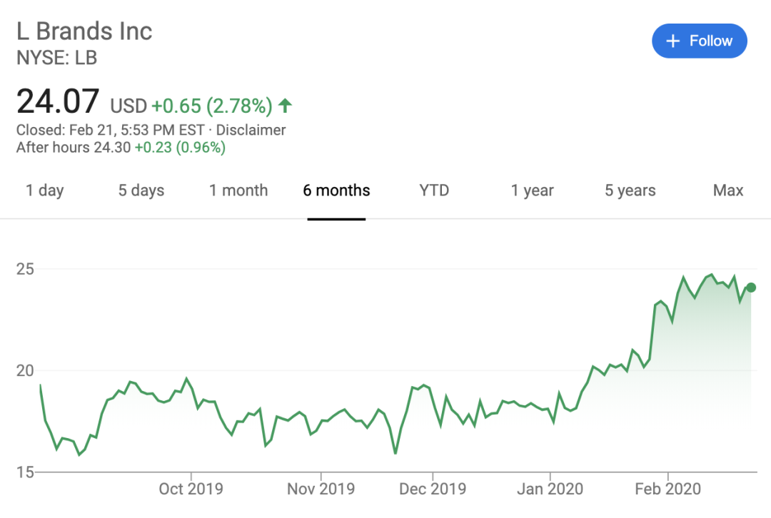 市场对于这次交易的反应也较为积极:自从L Brands要出售维秘的消息传出后,L Brands的股价就一路上扬,目前已经来到了近6个月的高位。