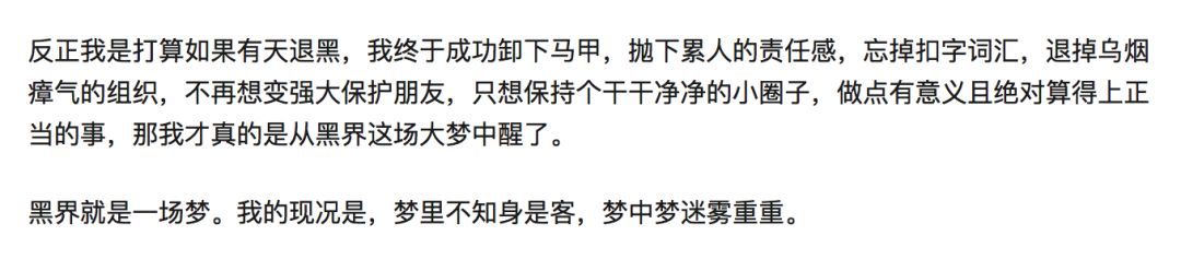 这个事的可怕之处在于,黑界是一个价值观混乱的场域:人生的目的、过程被简化,成功的定义和路径被设定得非常荒谬,罪恶的行为被美化甚至赞许。