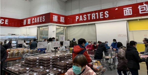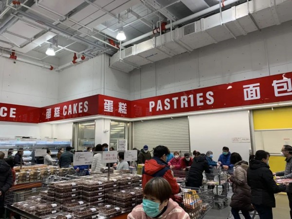 有网友反映,自己是2月21日下午13:30到达Costco的,店堂内显示1900多人,蛋糕、肉类区域人流较多,烤鸡和羊角面包都没了。店内公告称,为配合防控疫情,防止人流聚焦,烤鸡和羊角不售了。