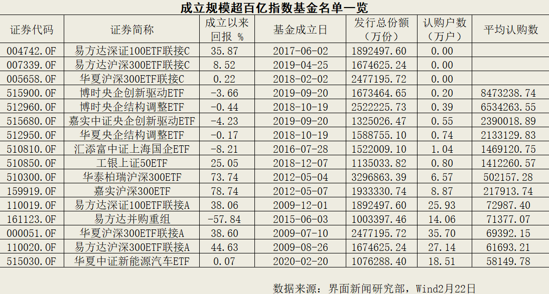 此外,我们将百亿级指数基金按户均认购量排序发现,央企、国企创新类ETF的均值偏高,最高的博时央企创新驱动ETF均值为847万份。这类ETF以上市公司股东换购为主;宽基指数的均值居中,既有大户,也有小散户;行业ETF均值最低,此次华夏中证新能源汽车ETF的平均每户认购量仅5.8万份。这个数据在全市场ETF中处于下游水平(中位数为10万份左右)。