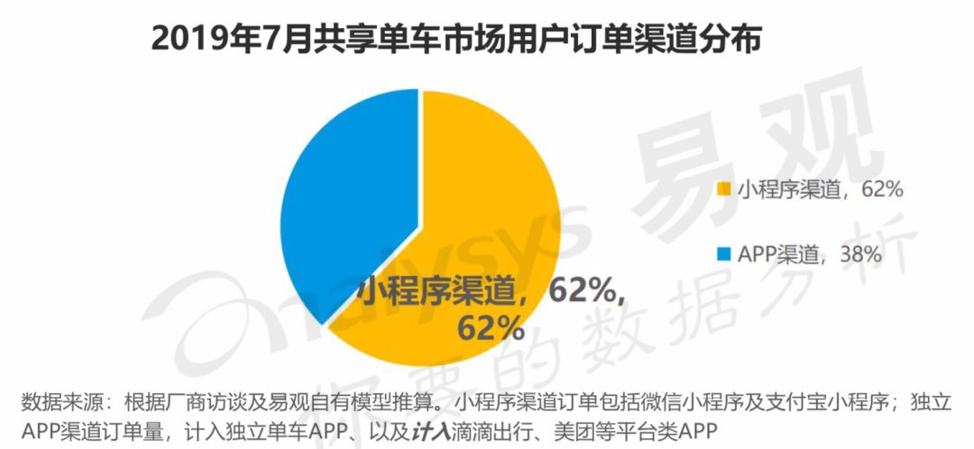 据易观统计,2019年6月,仅38%的共享单车订单来自独立APP端,62%的订单来自小程序渠道(包括微信小程序和支付宝小程序),小程序已成为共享单车行业最大的流量入口。