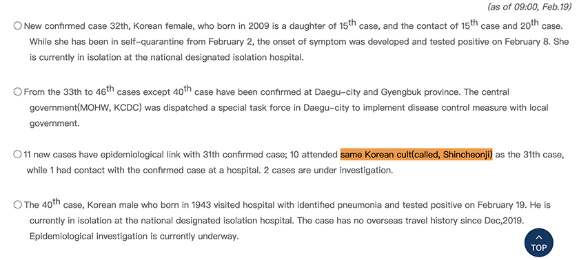 “我怀疑‘新天地’不会公开曾与第31号病例接触的信众的行动轨迹,也不会完全配合政府的追踪工作,”申显旭说,“他们担心这会披露自己的秘密传教活动,这实在令人担心。”
