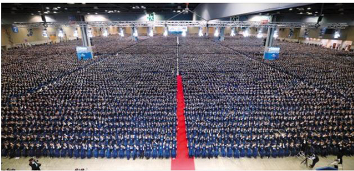 而每逢重大活动,新天地教会也会以万人为计出动。去年11月10日,该教会举办过一场声势浩大的“毕业典礼”,庆贺103764名信众顺利完成6个月的课程。由于人数过多,新天地教会不得不采用了直播的形式,在多地同时进行典礼。