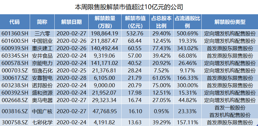 三年前回归A股的三六零(601360.SH)本周迎来大规模限售股解禁。Wind数据统计显示,本周共有30家公司合计92.43亿股限售股上市流通,以2月21日的收盘价计算(下同),解禁市值963.78亿元。其中,三六零一家公司解禁市值就超过500亿元。