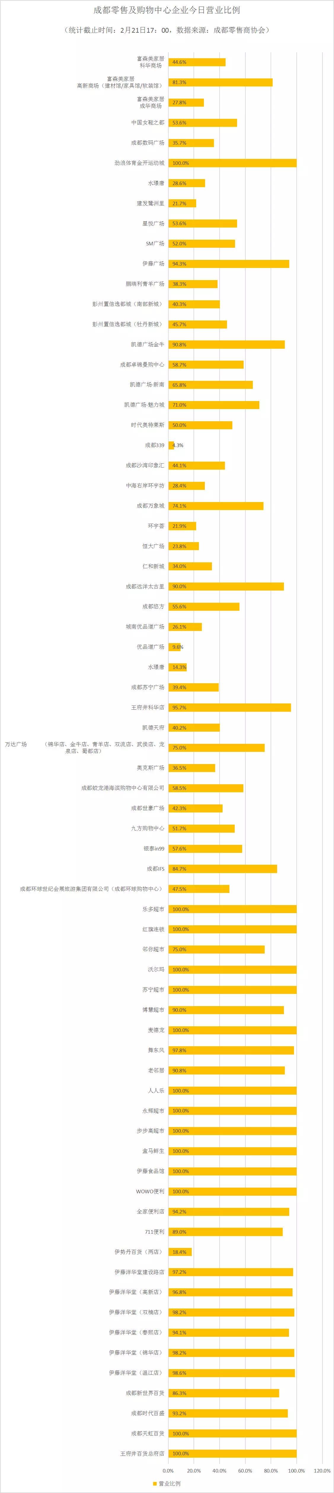 界面四川2月23日从成都零售商协会获悉,据不完全统计,截至2020年2月23日17时,零售企业及购物中心共计71家(百货12家;便利店3家;超市14家;购物中心36家;专业卖场6家)已经营业。全部商户总数22347家,其中,复工商户数量16415家,复工比例达73.5%,较昨增加0.2%。