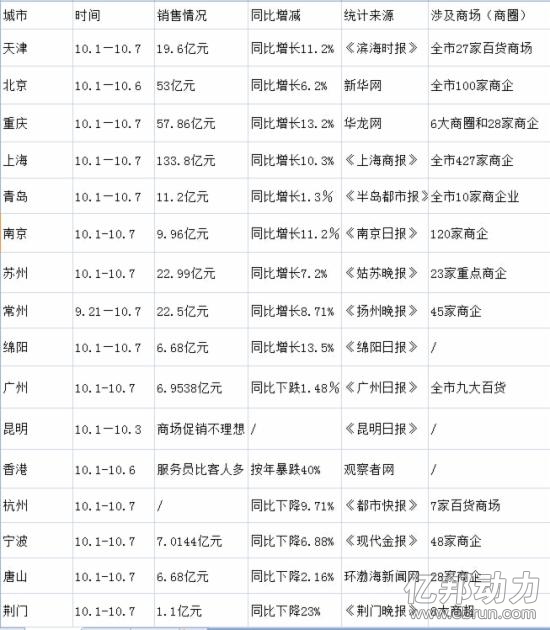 【编者按】十一国庆期间,对于各大城市的零售企业来讲,可谓一次重点促销的好机会。到处旅游和到处买买买的国人到底给城市零售业态带去怎样的消费增长?而面对电商的冲击和传统零售的寒冬期,今年的十一,传统实体零售的销售又将如何?国庆收假第一天,亿邦动力网特此盘点,带你一览16大城市商圈十一黄金周销售数据统计。