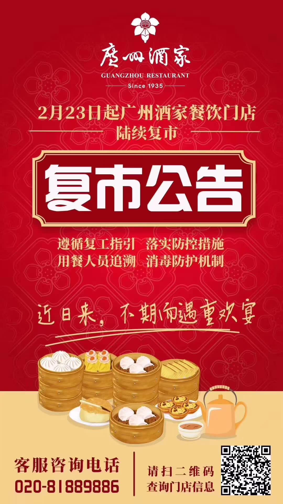 2月22日,广州酒家发布复市公告,从2月23日起广州酒家餐饮门店陆续复市。
