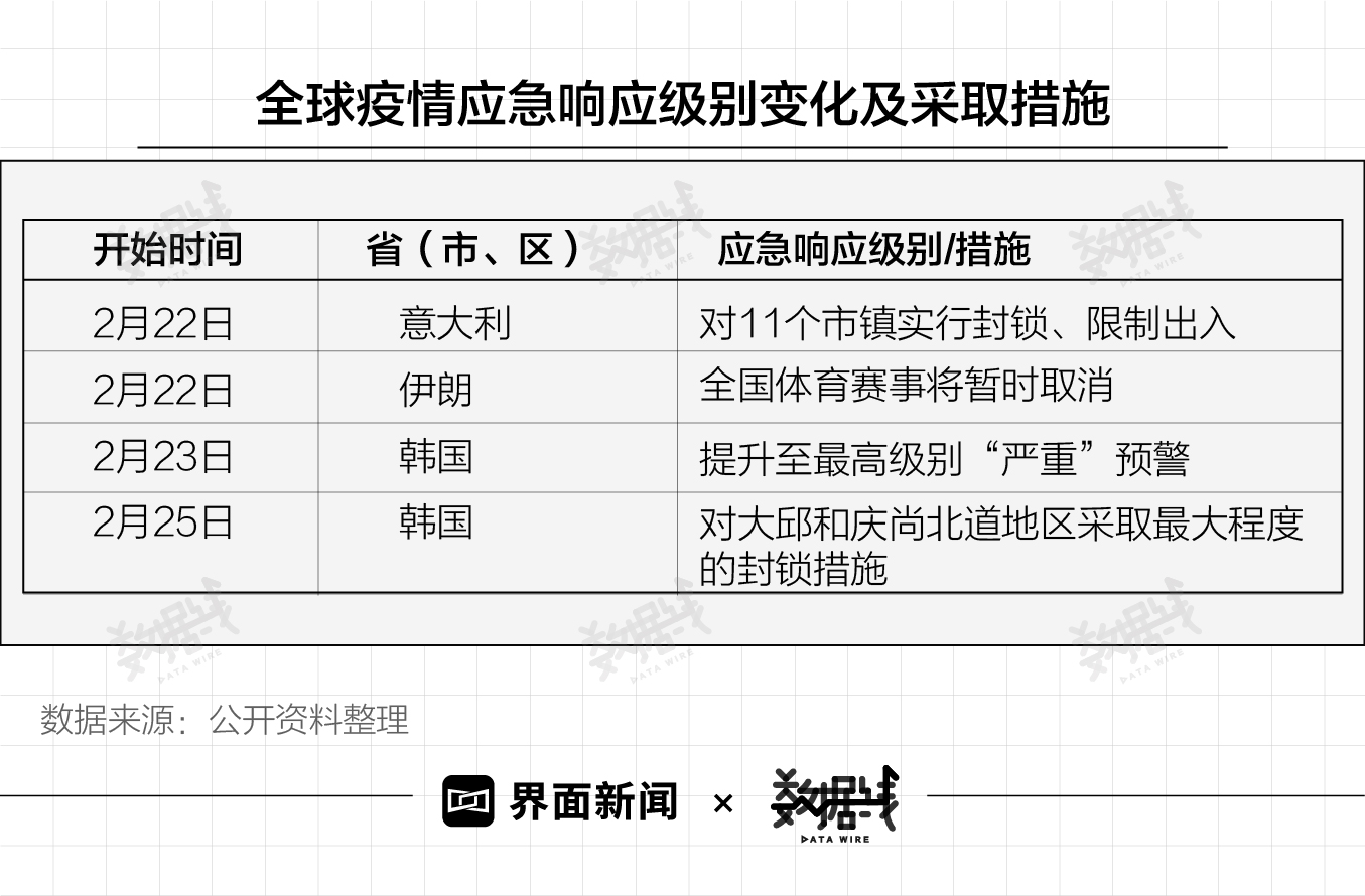 但从全球来看,意大利、伊朗和韩国等地新冠肺炎确诊病例陡增,多地采取相应措施并提高疫情应急响应级别。其中,韩国已于2月23日提升至最高级别“严重”预警。