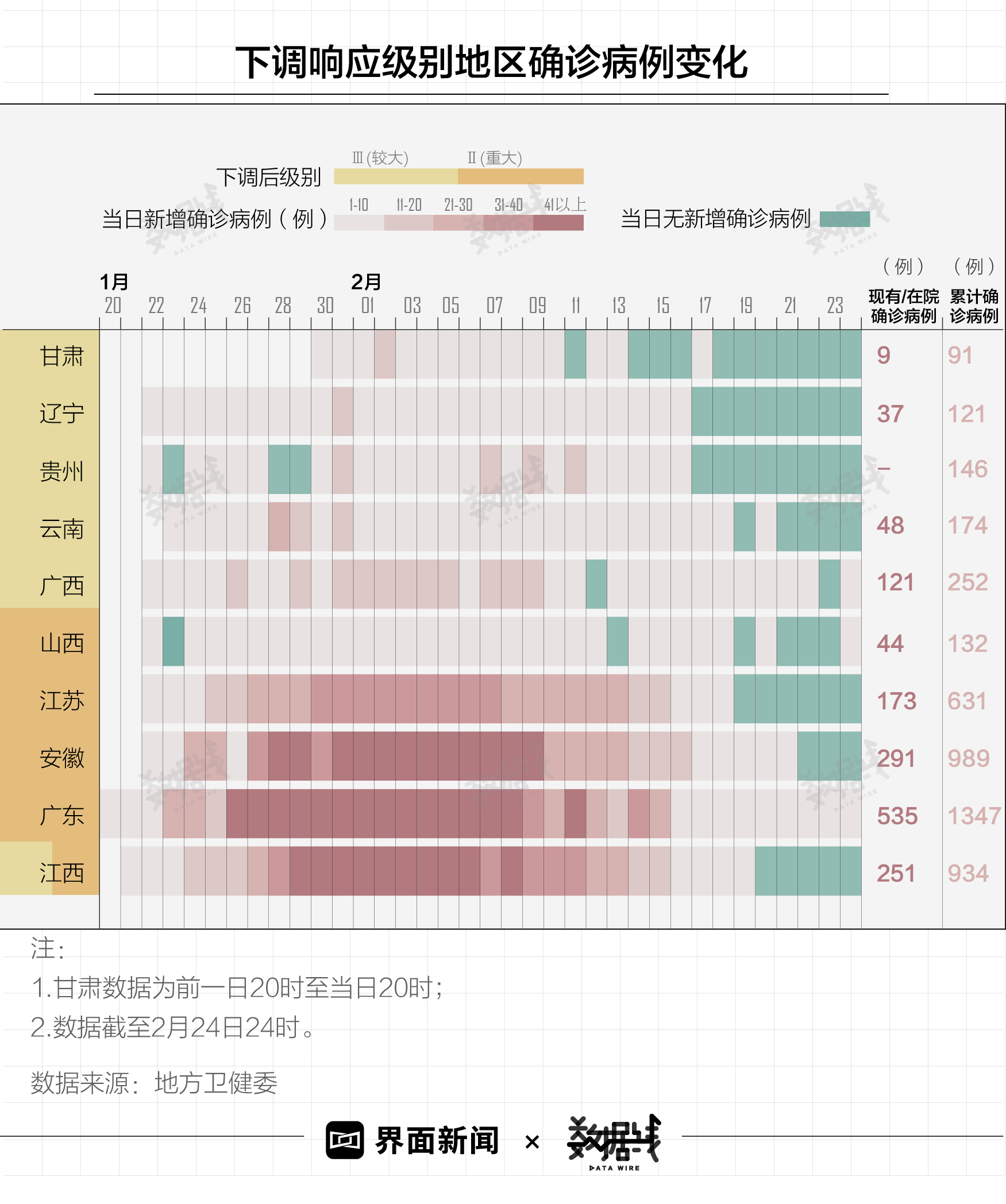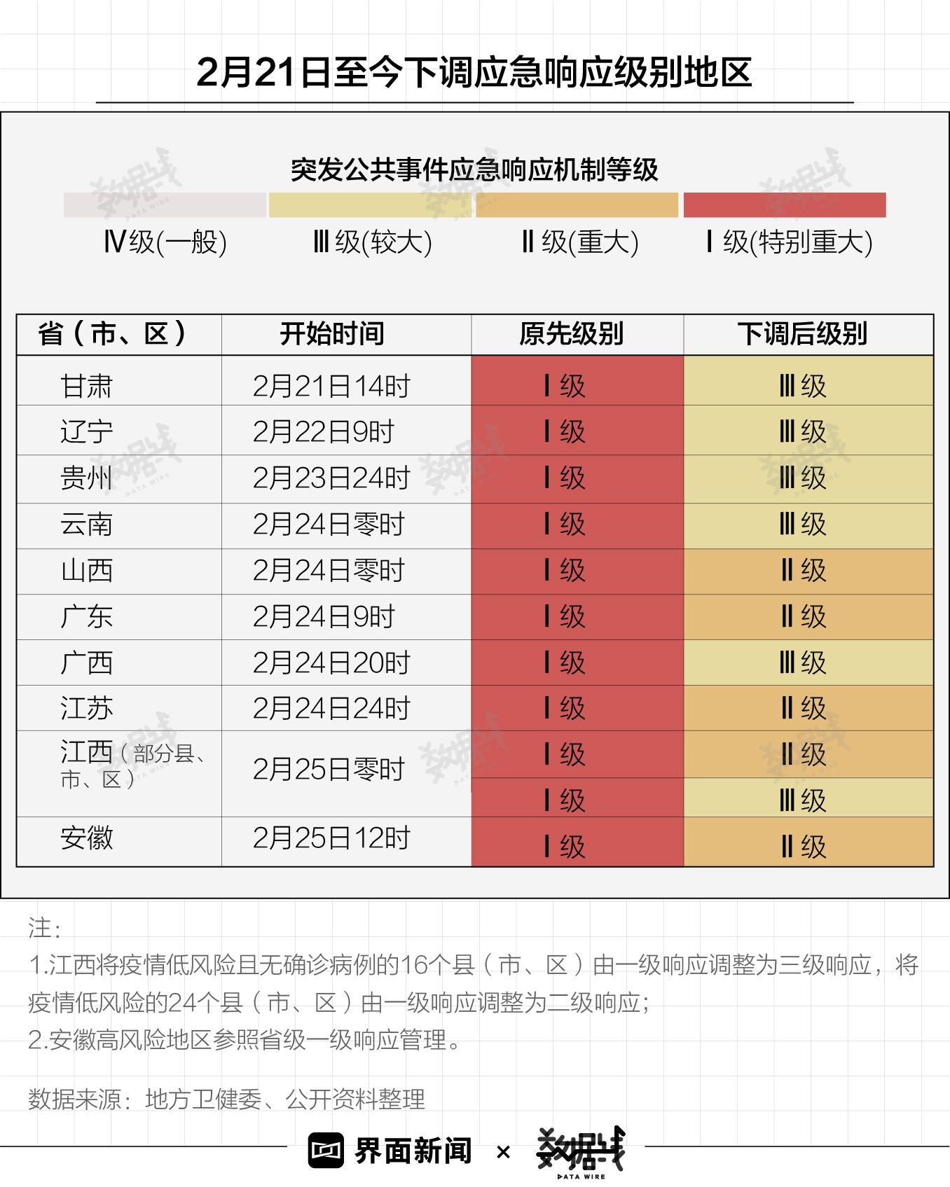 甘肃省首先于2月21日14时起,将新冠肺炎疫情防控应急响应级别由省级一级应急响应调整为省级三级应急响应。目前,共有5个地区下调至III级,4个地区下调至II级,江西则将视各县(市、区)情况,将不同地区下调至不同等级。
