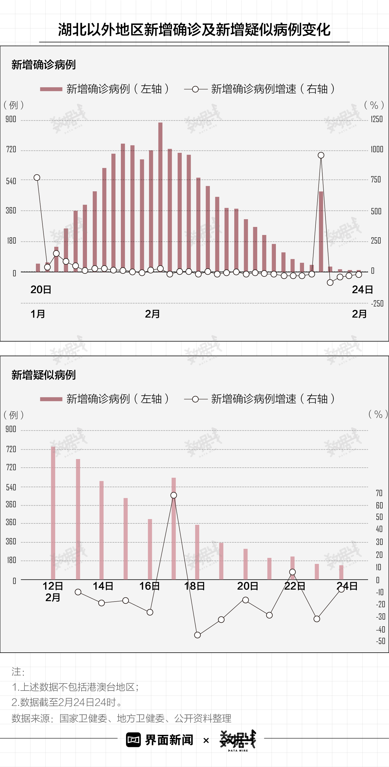 包括10个下调响应级别地区在内,目前全国疫情形势出现积极向好的趋势。据国家卫健委统计数据,2月24日0-24时,31个省(自治区、直辖市)和新疆生产建设兵团新增确诊病例508例。其中,湖北省新增确诊病例499例。这意味着,湖北以外地区新增确诊病例数为9,系首次降至个位数。