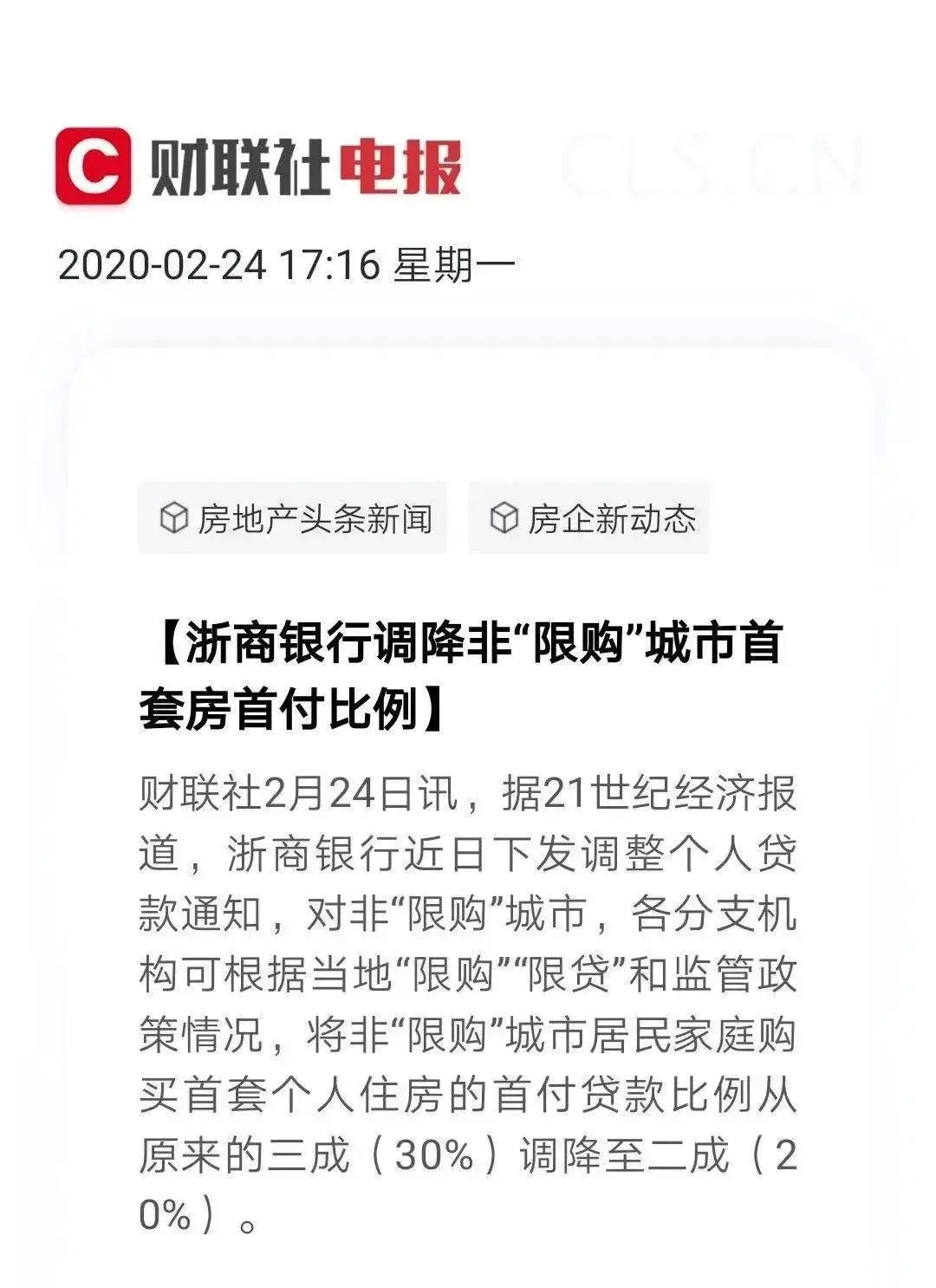 浙商银行下发调整个人贷款通知,对非“限购”城市,各分支机构可根据当地“限购”“限贷”和监管政策情况,将非“限购”城市居民家庭购买首套个人住房的首付贷款比例从原来的三成(30%)调降至二成(20%)。