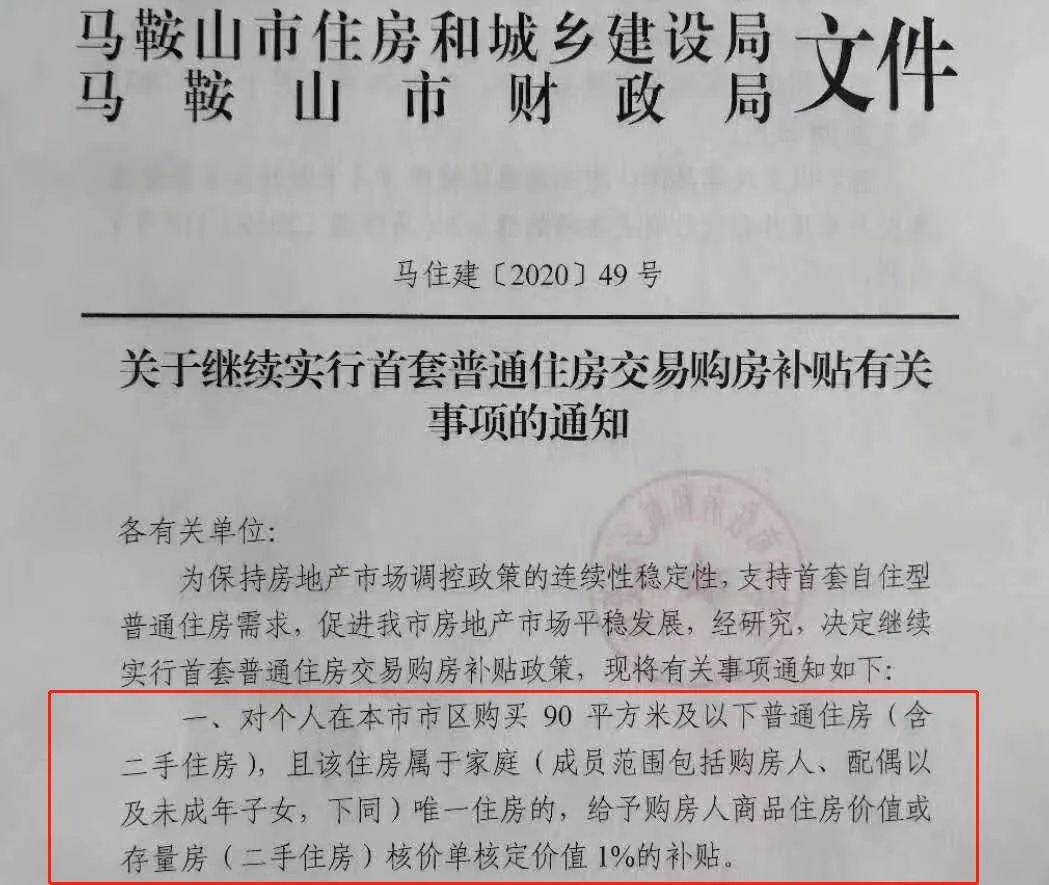 2月18日,马鞍山市正式对外发布,对所有在马鞍山首套购房家庭,提供补贴政策有效期一年!最高补贴总房款的1.5%!
