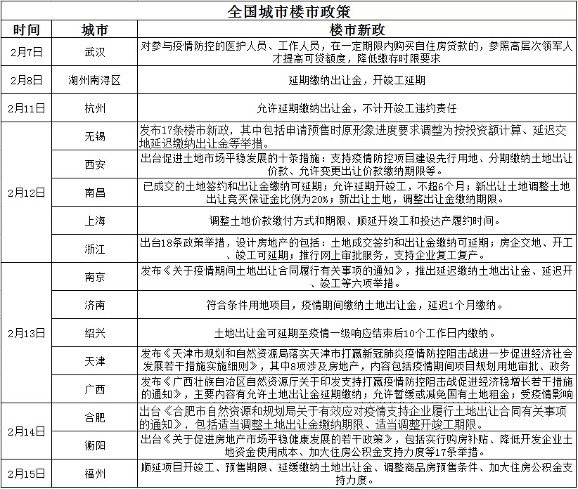 从2月初开始,武汉、杭州、无锡等多省市连续出台涉及房地产或专门针对房地产市场的政策,政策主要围绕土地出让、开工竣工、公积金等层面。