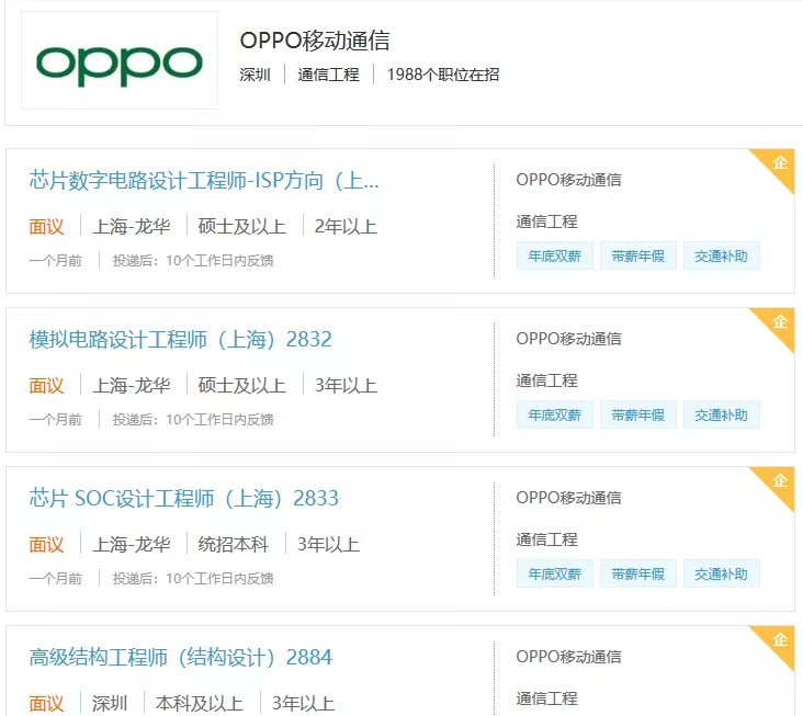去年8月,OPPO通过猎聘网以及BOSS直聘网发布了不少职位。