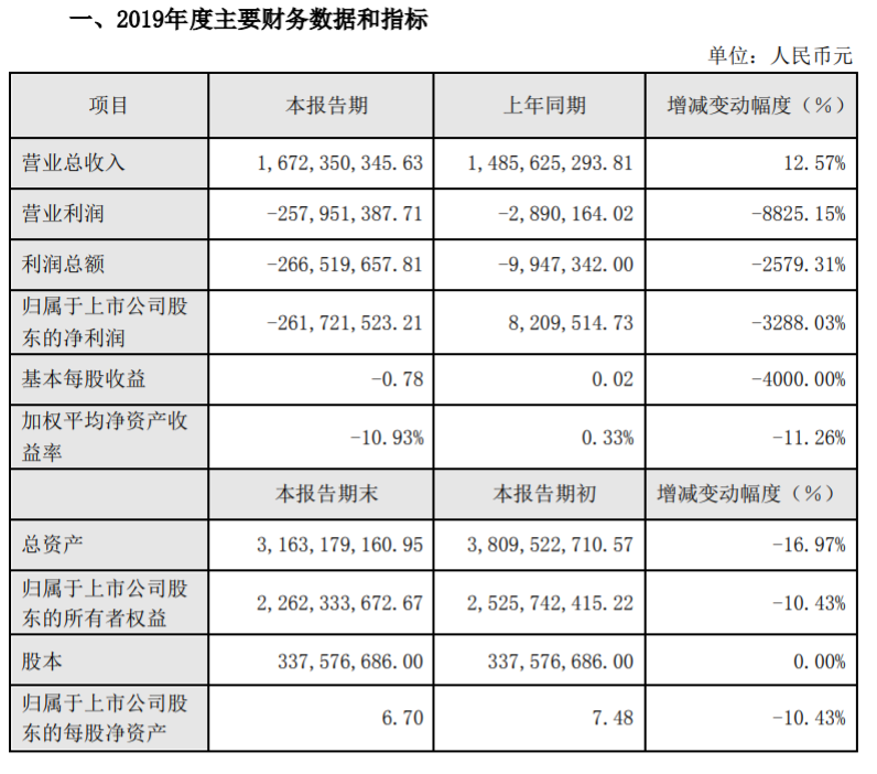 2月25日,中科金财(SZ:002657)发布业绩快报,2019年营业总收入16.72亿元,同比增长12.57%,归属于上市公司股东的净利润亏损2.62亿元,同比减少3288%;营业利润亏损2.58亿元,同比减少8825%;利润总额亏损2.67亿元,同比减少2579%;基本每股收益-0.78元,同比减少4000%。