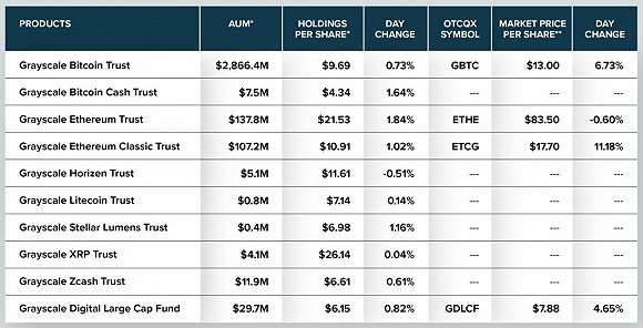 每一种加密货币又会对应一种信托,或者众多加密货币组合对应一种信托。例如比特币信托、以太坊信托、莱特币信托、比特现金信托、瑞波信托、Zcash信托等只对应一种加密货币,多元化加密投资组合(Digital Large cap)则是多种加密货币的投资组合。